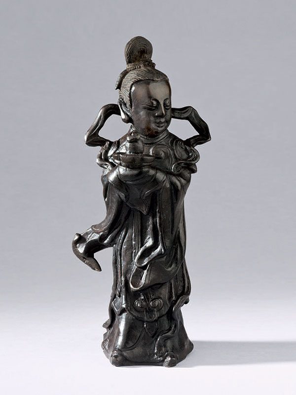 A bronze female figure depicted in a standing position, holding a bowl with a peach. She is dressed in layered robes and a shawl decorated with a continuous pattern of large ruyi heads, and a ribbon-like long scarf around her neck. Her head is turned slightly towards the left, with her hair neatly tied up into a bun. Her demure face is well defined with downcast eyes, arched nose and full lips. The bronze is of even, dark brown colour.