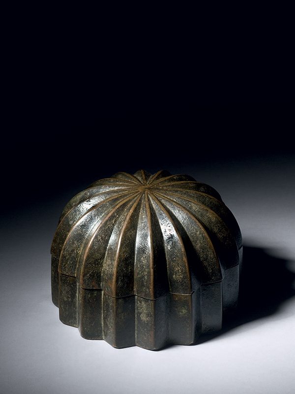 A bronze pandan box of circular form with a convex lid. Both the box and its lid have  deeply ribbed, angular gadrooning around the sides. The apex of the lid is marked  by the intersection of the ribs. The box has a rich, deep brown patina. Inside the box are preserved the remnants of an old document inscribed by hand in what most probably is Farsi Arabic, the language of the Mughals.