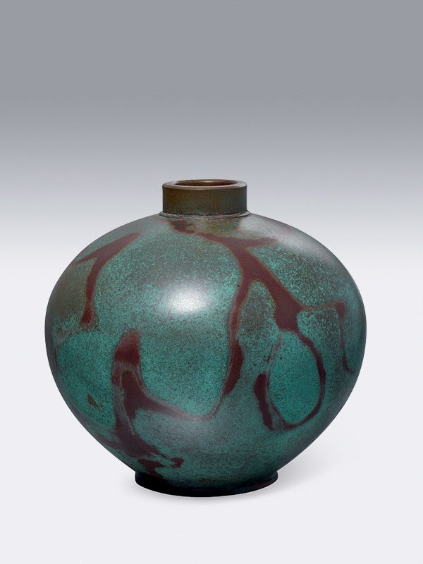 A bronze vase, the bulging sides rising from a short foot rim and with recessed base. The sides rise up to a short, straight neck. The exterior of the vase is covered in a mottled blue patina with irregular red stripes, creating an interesting pattern. The base is impressed with an oval mark with the signature of the maker: Hannya Kankei.