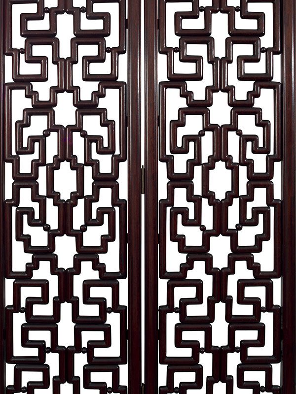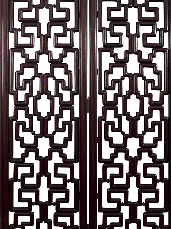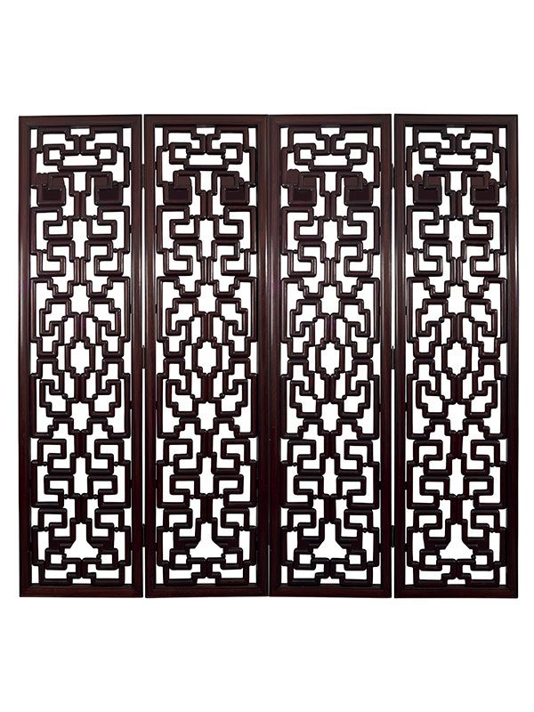 A four-leaf screen, made out of heavy wood, each of the four panels mounted with a separately carved, openwork geometric sheet, neatly dovetailed into the rectangular frame. Each panel has a decoration of geometric elements that are bent at the corners to form an intricate pattern. The frames of the panels have channelled rims.