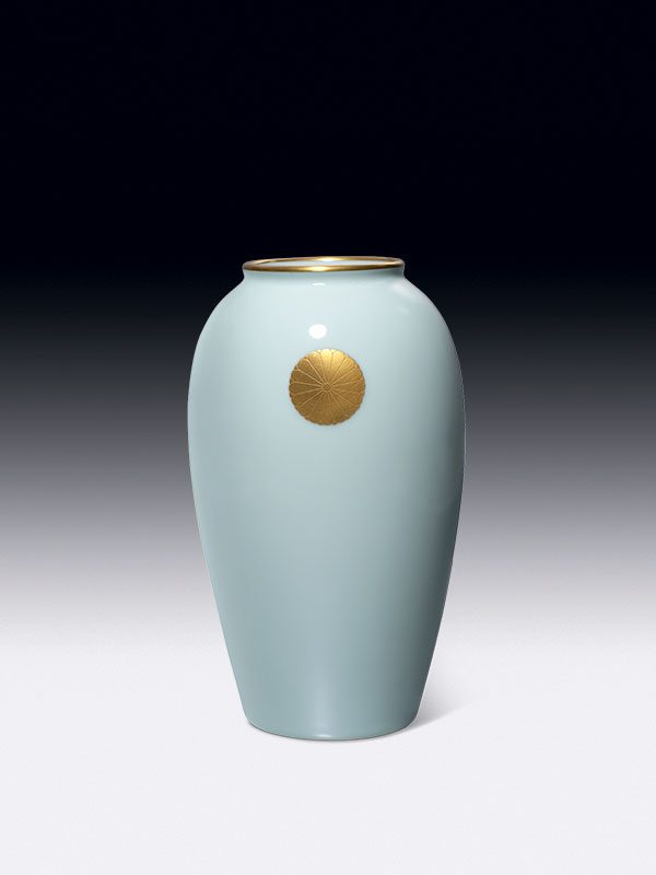 A porcelain vase of ovoid shape, supported on a countersunk base. The bulging sides end in a small mouth rim. The vase is covered on the exterior with a very pale celadon glaze that has as its only decoration a sixteen-petalled, gilt chrysanthemum on the shoulder. The mouth rim is also gilded. The base is painted in gilt with the Fukugawa mark.