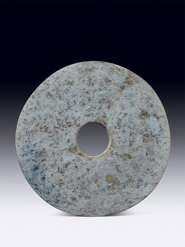 JADE BI-DISC Late Neolithic period to Western Zhou dynasty, c. 3000 BC – 9th century BC Diameter: 7 1/2 inches, 19 cm Thickness: 1/4 inch, 1cm 玉璧 A jade bi-disc, the central aperture drilled from two sides. The stone of predominantly whitish tone with some green inclusions.