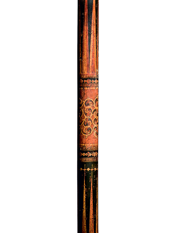 A halberd consists of an axe blade and a sharp spike mounted on the end of a long staff. Halberds were made in many shapes and variations and the Ceylonese version, patisthanaya, is based on a design much like that of the European partizan.[1]  The word halberd is probably an amalgamation of the German words Halm (staff), and Barte (axe). The halberd was the primary weapon of the early Swiss armies in the 14th and early 15th centuries and has been used as a court bodyguard weapon for centuries; indeed it is still the ceremonial weapon of the Swiss Guard at the Vatican. This unusually large and complete halberd is beautifully lacquered in designs of red, yellow and black typical of the decorative Kandy style[2]. The sturdy construction of the blade and the way it is fixed to the shaft with long straps and lugs, as well as the overall quality of this piece suggest that this was a fully functional weapon, rather than a processional piece or item used purely for status.