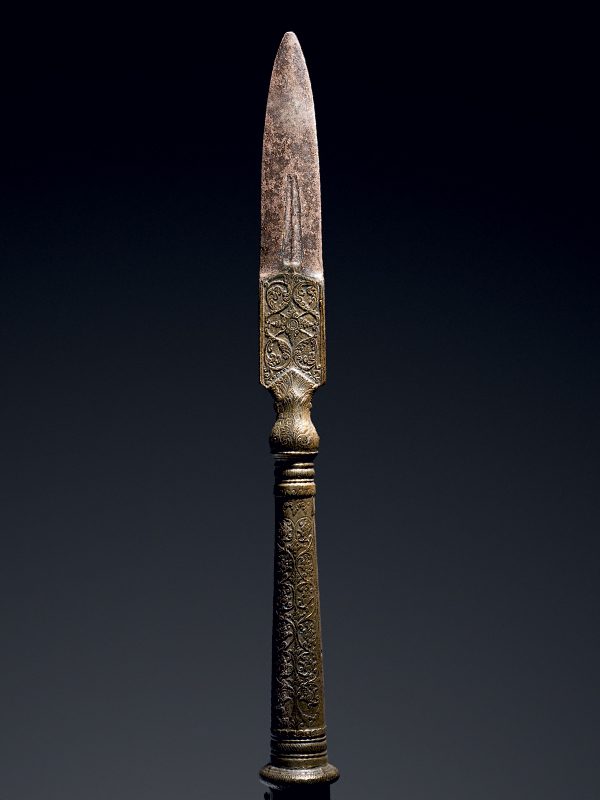 A large halberd or spear, of a type known as patisthanaya. The long wooden shaft is lacquered in red, black, yellow and green with various designs including scrolling and intertwined tendrils, wavy and geometric motifs. The steel halberd head has a dark patina, with a sturdy blade designed for use, and decorative chiselled elements at the base. The metal head of the spear is attached to the shaft with two long steel straps and two projecting steel lugs are fixed onto the shaft to further fix the head to the shaft. A simple, undecorated steel cap is fixed to the bottom.