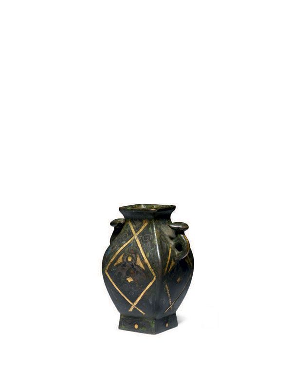A miniature bronze vessel of archaic fanghu form, of baluster shape and square section, supported on a short foot and flaring outwards at the neck. Two small loop handles with taotie masks on the top adorn the upper part of the vessel. Each side of the body is decorated with a gold inlaid diamond.shaped pattern, containing elaborate silver inlays of swirl and heart.shaped patterns. The bronze is predominately of brown colour, with some areas heavily patinated in a dark green colour.