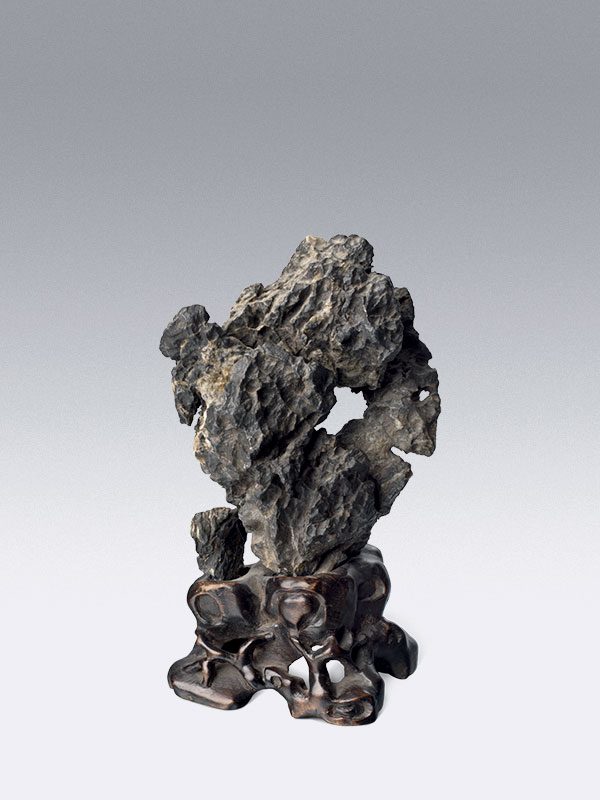 A limestone miniature rock formation, consisting of a larger rock with a central aperture and a very small rock by its side. Both rocks are fitted to a carved wood stand, which is original. The material is of a dark grey, almost black colour and has some pale grey striations and exudes a distinct metallic tone when struck.