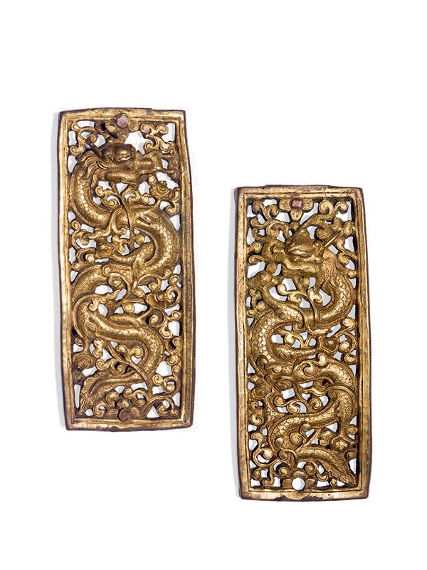 A pair of giltbronze belt plaques of rectangular form. Each plaque is decorated in openwork relief with a sinuous dragon, the surface of which has a ring-punched design. The dragon’s heads are well defined with bulging eyes, arched eyebrows and ears, bushy mane, and two pointed horns. Each of the dragon’s four three-clawed feet holds a round object, possibly a pearl. The dragons appear to weave in and out of the tendril background. Either end of the plaques has a drilled hole for attachment to another material. The gold patina overall is well preserved.
