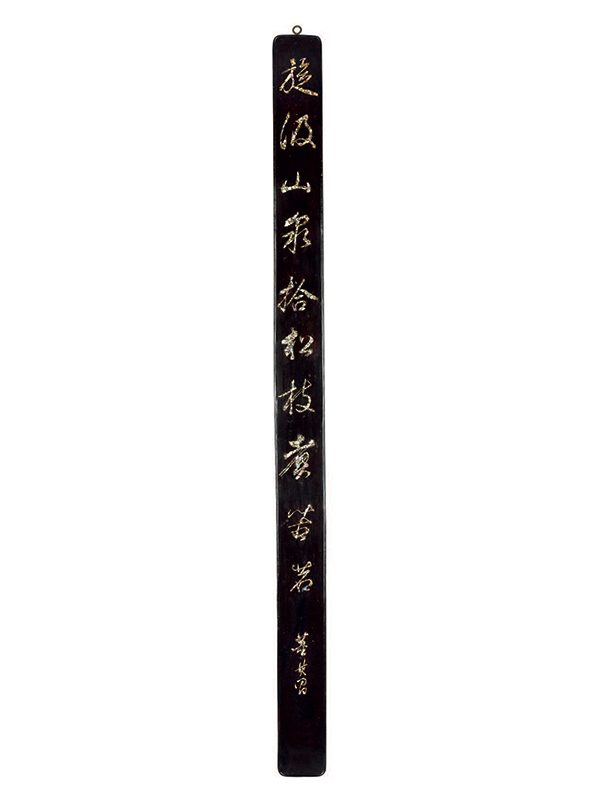 A pair of black lacquer panels inlaid with pieces of mother-of–pearl with an inscription of 25 Chinese characters in semi-cursive script, including 22 larger and 3 smaller characters. The larger characters are an aphorism originally from an article recorded in the He Lin Yu Lu. The three smaller characters are the name of Dong Qi Chang (1555 - 1636), a famous Chinese calligrapher and painter of the late Ming dynasty.