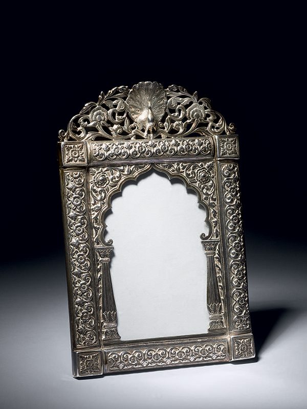 A hammered and etched silver frame. The central area for inserting the image is contained within a cusped mihrab arch with columns to either side. The spandrels on either side of the mihrab contain arabesque sprays of stylised flowers. A simple slightly convex border frames the central scene and is decorated with further arabesque sprays of stylised flowers. This rectangular frame is crowned by a semi­circular open­worked floral scene with a peacock showing its feathers in its centre. The back is of plain silver which slots into the front part on the bottom corners, the top two corners have two simple turning knobs to secure it. A large hinge is fixed to the  back to enable the