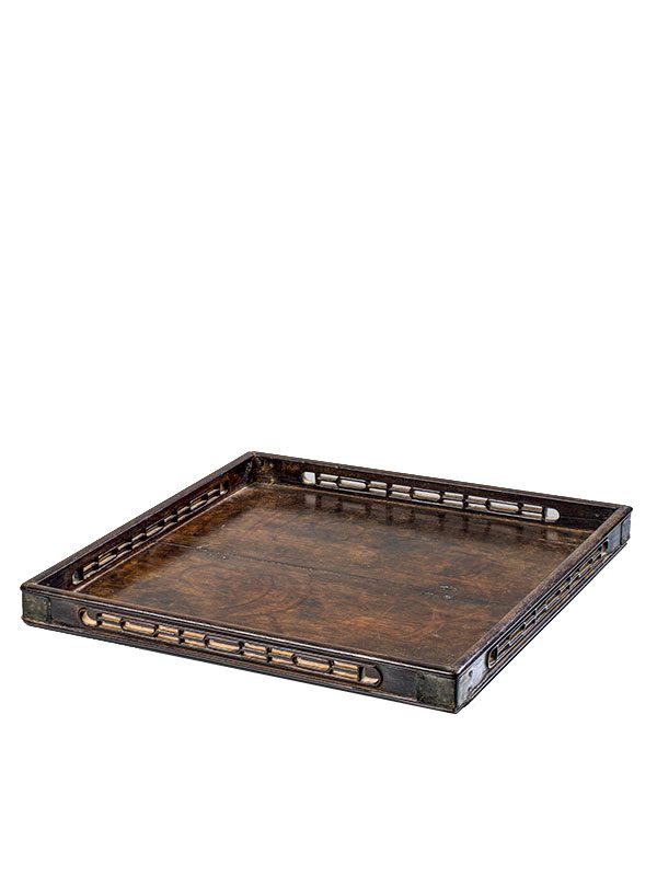 A zitan square stationery tray, the base made up of two panels, bolted together with metal mounts. The straight rim consists of four pieces of wood, the corners reinforced with metal mounts. The four sides are pierced in the middle with oval and square apertures. The wood has the purplish hue of zitan, with characteristic minute silvery streaks.