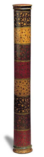 A document holder of cylindrical form, witha removable flat cover to either side. The document holder is applied with papier-mâché on a cloth covered wooden base, which is painted and lacquered with floral motifs in panels, each on a different-coloured background. The inside is painted with tiny gold flowers on a red ground.